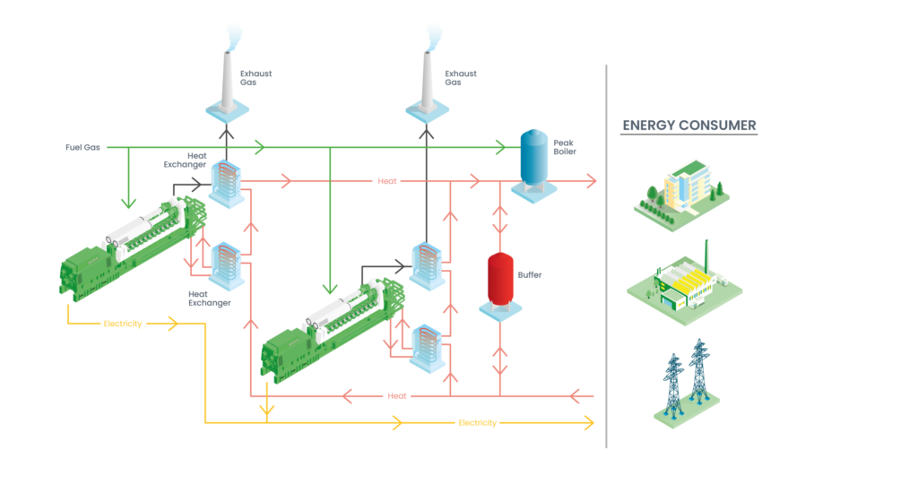 Решенията за когенерация или комбинирано производство на топлинна и електрическа енергия (CHP) са високоефективни поради едновременното производство на електричество, топлина и/или охлаждане от един източник на енергия, обикновено природен газ. Това го прави отлично, интелигентно решение за различни индустрии, производство, инфраструктура, оранжерии и централно отопление. Когенерацията помага да намалите разхода на гориво с приблизително 30% в сравнение с отделното производство на електроенергия и топлинна енергия. Ние ще намерим решение за Вас, независимо от мащаба на Вашия бизнес.