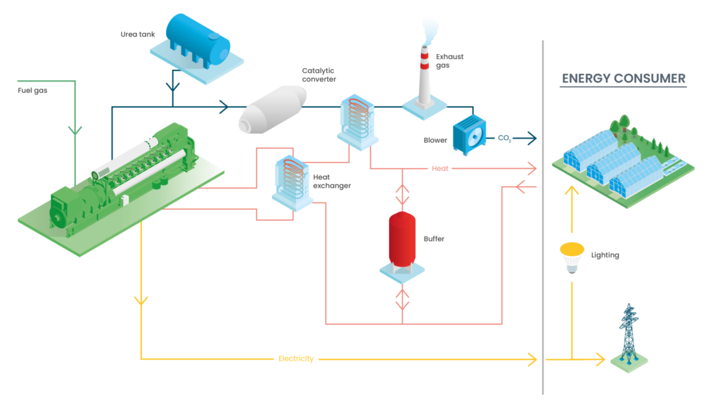 Енергията, създадена от когенерационни системи с газов двигател в оранжерии, може да се използва по различни начини. Електричеството може да осигури мощността за изкуствено осветление и/или да бъде подадено в обществената мрежа. И докато топлината може ефективно да отговори на изискванията на оранжерията, CO2