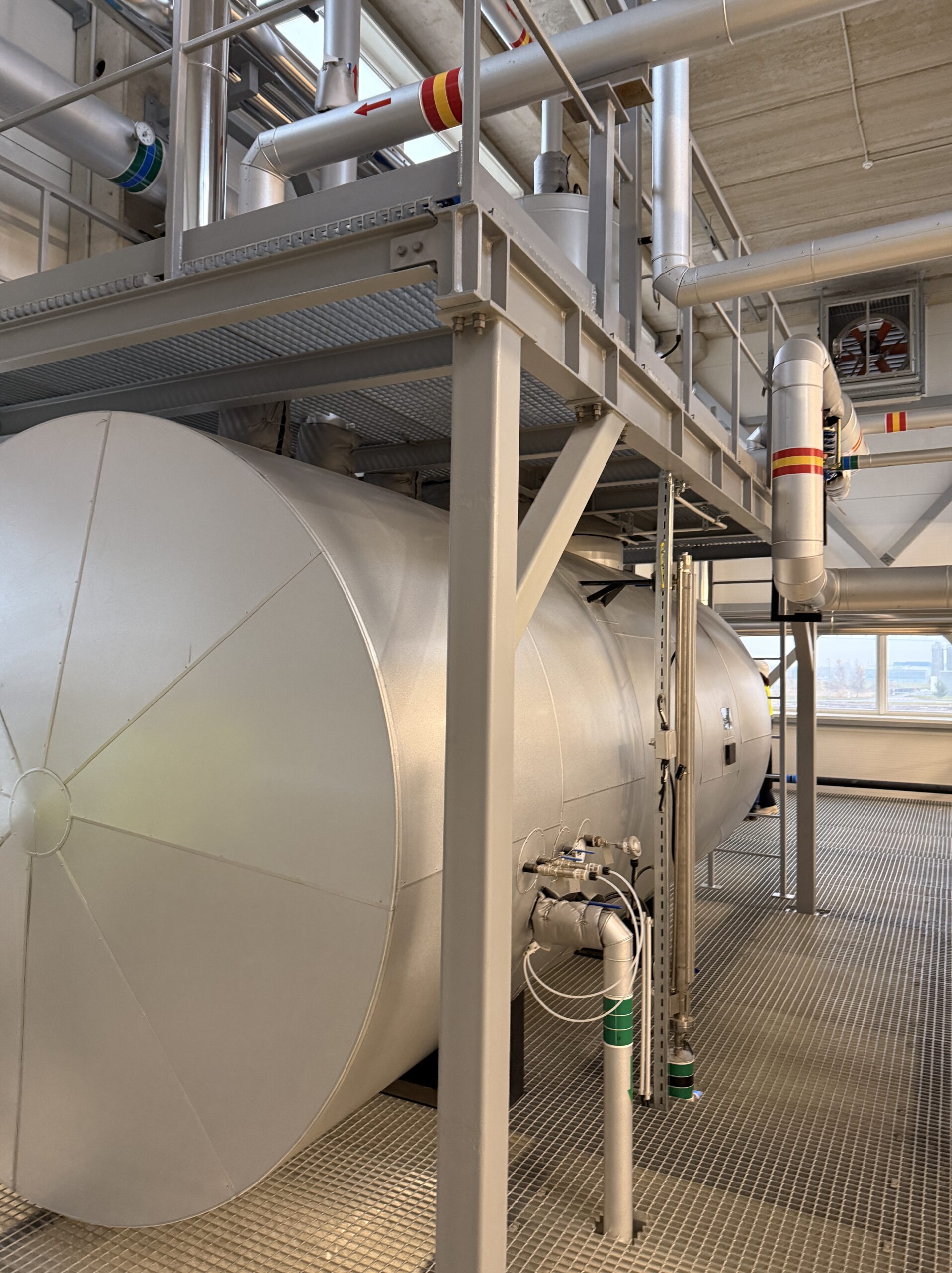 A thermal deaerator operating at 0.2 barg was designed for feedwater treatment, featuring a 15 m³ storage tank and a 20 m³/h deaeration column. Before entering the deaerator, demineralized water is preheated in a heat exchanger utilizing heat from the boilers’ continuous blowdown.