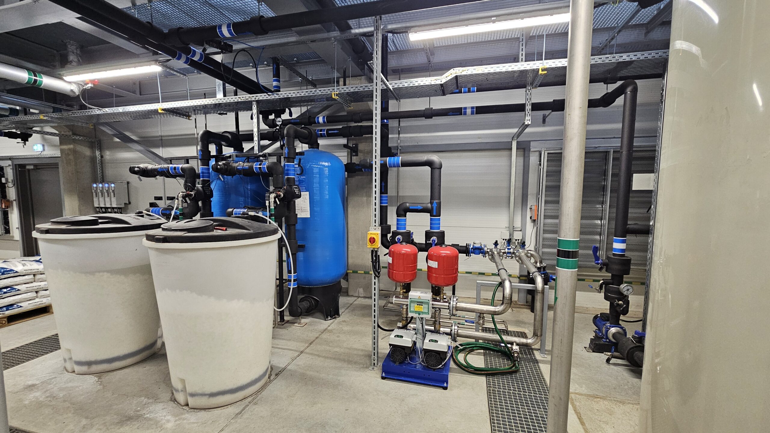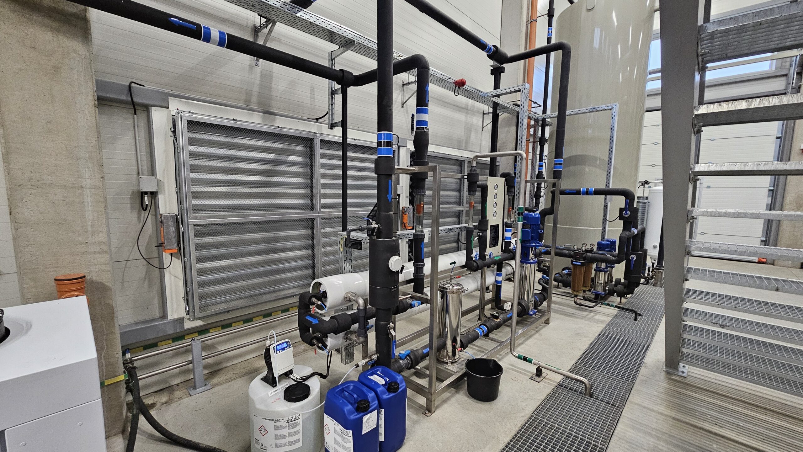 The water treatment system includes mechanical water filters, water softening filters, and a reverse osmosis unit. Softened water is stored in a 10 m³ tank, while demineralized water is stored in a 6 m³ tank.